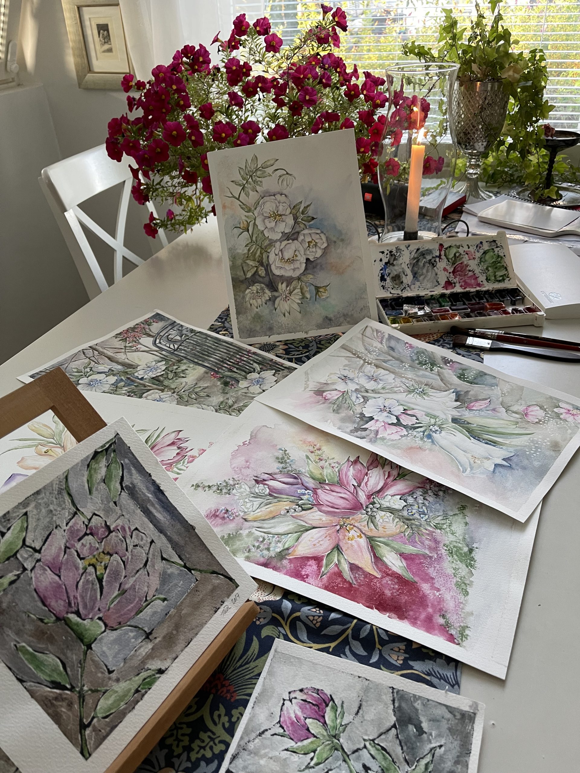 Saan inspiraatiota maalauksiin ja korttiaiheisiin luonnosta. Suunnittelen kortteja usein myös asiakkaiden tarpeiden ja toiveiden mukaan. Tällä hetkellä asiakkainani on pääsääntöisesti kukkakauppoja, joten valikoimaan on tullut mukaan myös surukortit ja adressit.