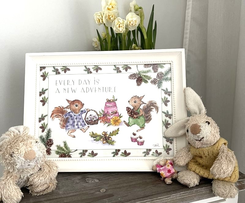 A4 kokoiset satuaiheiset printit on painettu akvarellityyliselle ohuelle kartongille ja ne voi kehystää itse mielensä mukaisesti.